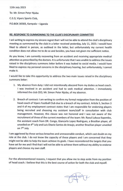 According to a letter dated Tuesday, 11th July, that Pulse Sports saw, Vipers claim that Isabirye has gone absent without leave for six days.