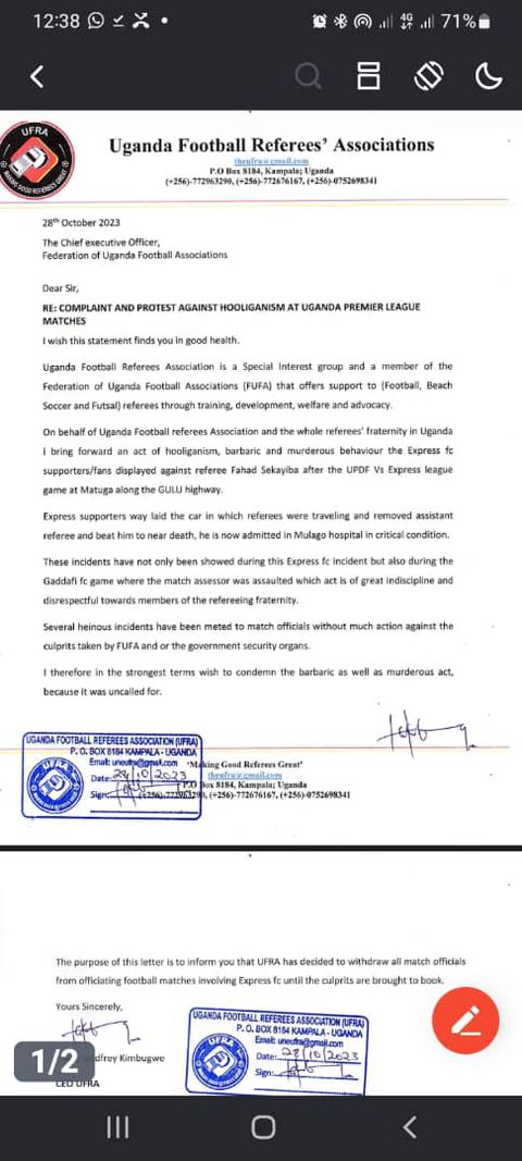 Meanwhile, FUFA has yet to make a statement on both the Friday incidents and UFRA's concerns or the decision take as per the letter.