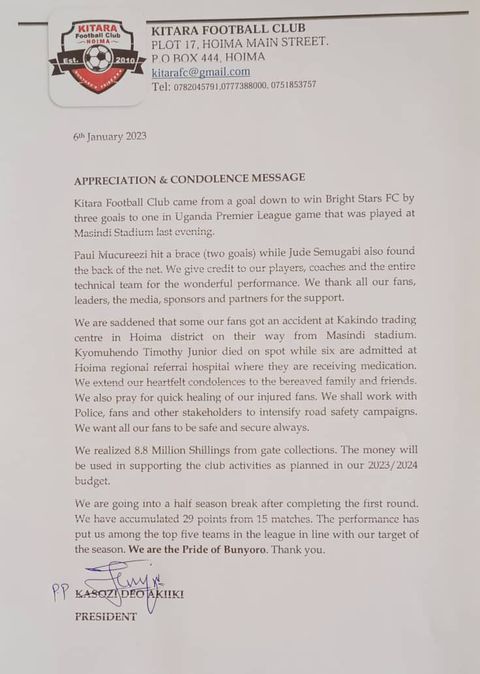 “We are saddened that some of our fans got an accident in Kakindo trading centre in Hoima district on their way from Masindi Stadium,” a statement signed by Kasozi started.