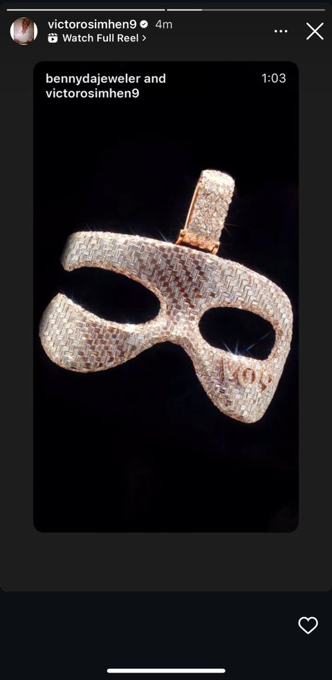 The piece, designed by New York-based jeweller Benny The Jeweler, features over 275 carats of emerald baguettes and carbon fibre, all shaped into a mask that mirrors the iconic look Osimhen often sports on the pitch.