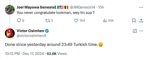 However, many fans were looking forward to one from Victor Osimhen, but the conclusion from some was that the on-loan Galatasaray star didn't congratulate his colleague.