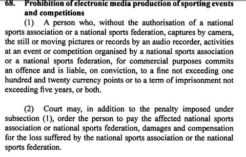 Article 68 prohibits the unauthorised capture and recording of sporting events or competitions by electronic media for commercial purposes.