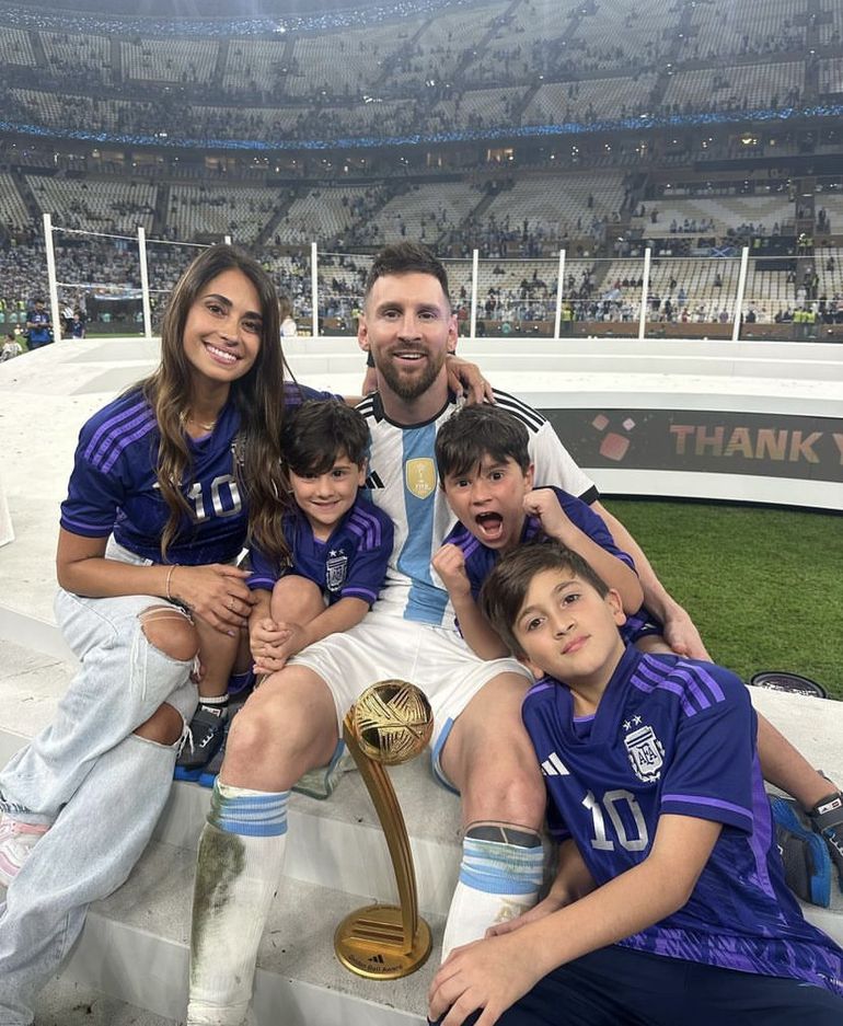 Lionel Messi and his family pose for a celebratory photo after Argentina’s 2022 World Cup final win| Photo Credit: Instagram(@antonelaroccuzzo)
