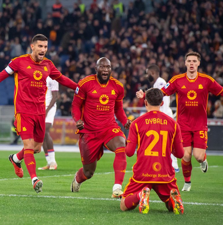 Romelu Lukaku celebrates his goal with his Roma teammates. (Photo Credit: Roma/X)