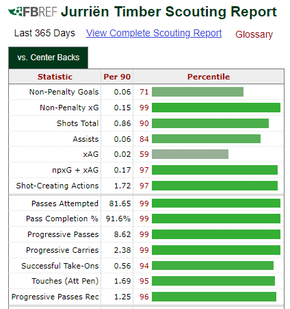 Timber’s style is much more suited to this proposition, according to FBRef, the Dutchman attempted 81.65 passes with a 91.6% completion rate while also playing 8.62 progresses passes and averaging 2.38 progressive carries per 90, putting him in the top 1% among centre-backs in Europe last season for each of those stats.