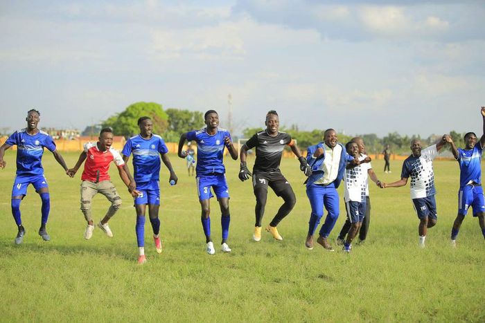 Kikomeko celebrates with Mbale Heroes players after earning promotion to the FUFA Big League