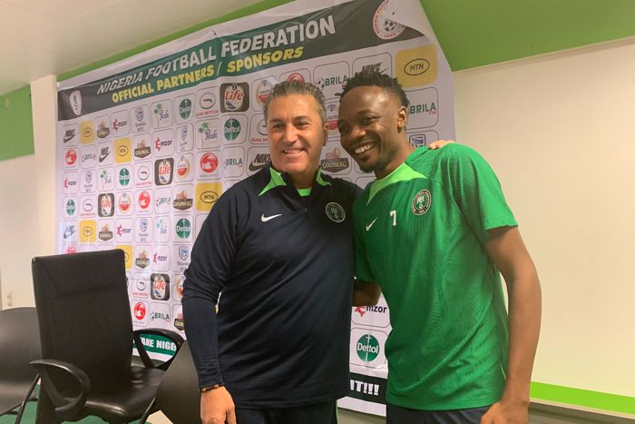 Ahmed Musa(L) and Jose Peseiro (C) at the pre-match press conference of the game against Guinea Bissau