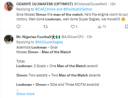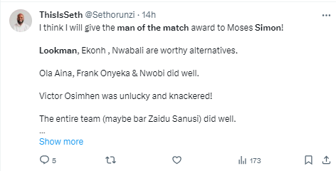 See what Nigerians are saying after Moses Simon beat Ademola Lookman deserved Man of the Match following the Super Eagles against Angola