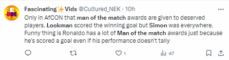However, Simon who was provided the assist was selected by the Confederation of Africa Football (CAF) Man of the Match in their CAF Africa Cup of Nations quarter-final triumph over Angola.