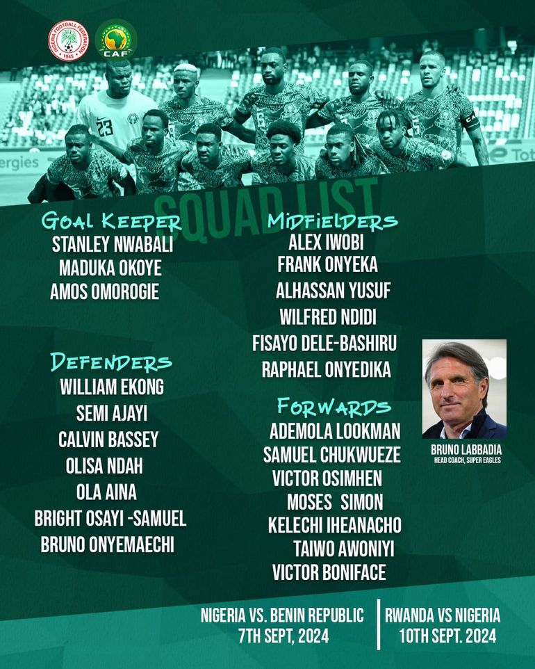 Several key players have returned to the squad, including Captain William Ekong, wing-back Olaoluwa Aina, and forwards Victor Osimhen and Taiwo Awoniyi.