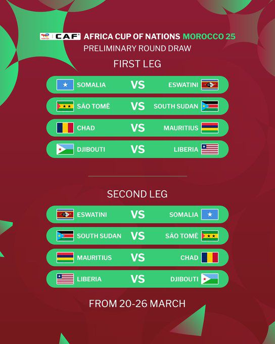 Somalia will battle Eswatini, as Chad will tussle it out with Mauritius, while Liberia has been placed with Djibouti.