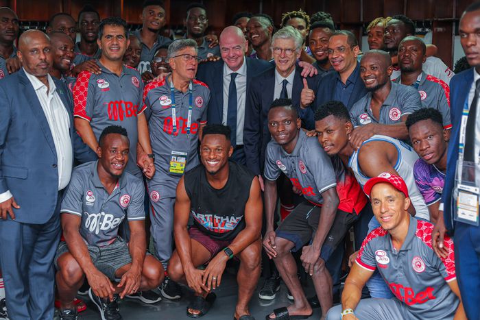 Arsene Wenger and Gianni Infantino with the Simba players and staff at the Benjamin Mkapa Stadium|SIMBA SC IMAGE