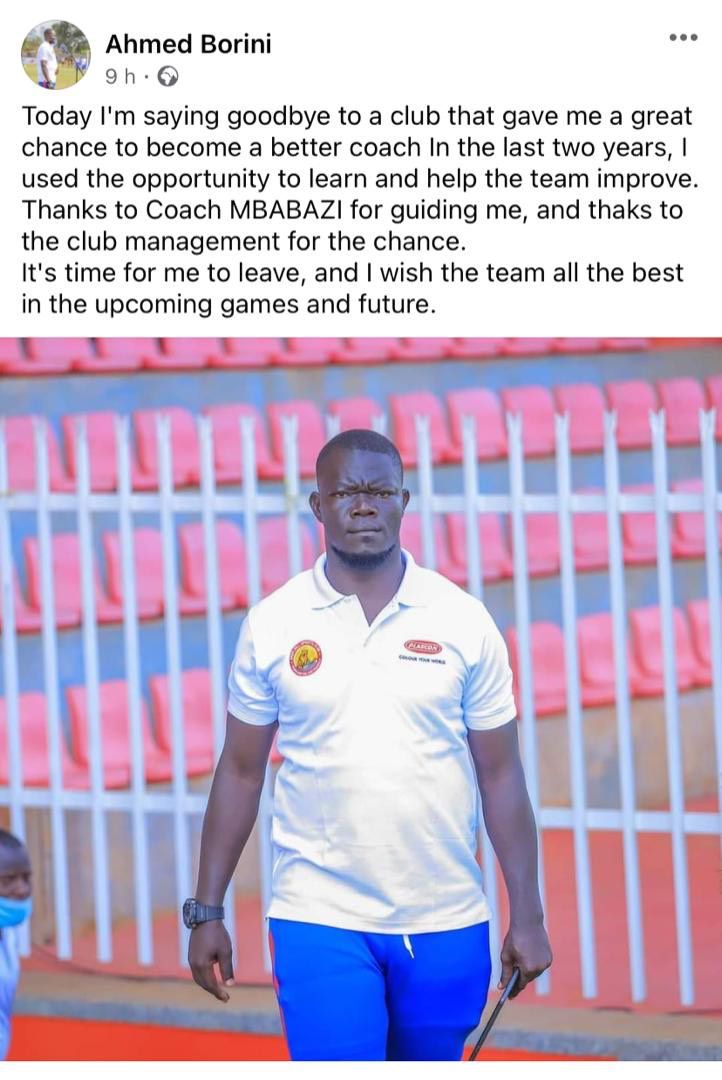 Assistant Coach Ahmed Borini is the latest member of Arua Hill SC to vacate the West Nile outfit.