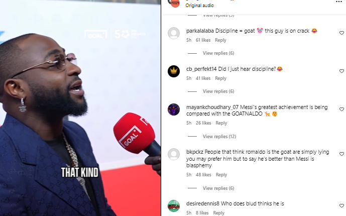 Davido was questioned by GOAL about his opinions on the Cristiano Ronaldo vs. Lionel Messi argument for the title of greatest player of all time at the award ceremony.