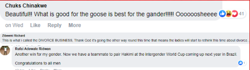 Other fans thank Hakimi saying, "Men 2:0 Women. Thank you Hakimi for the asist."
