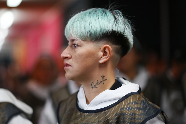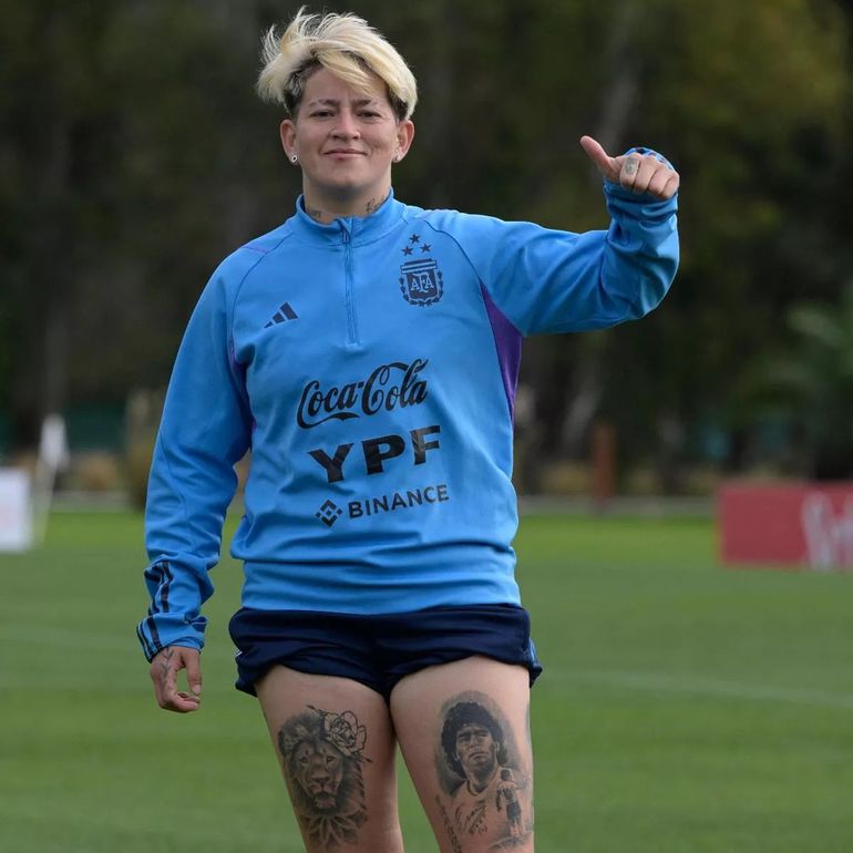 The 25-year-old, who plays for Brazilian club SE Palmeira, was pictured on the substitutes bench at Eden Park, during Argentina's World Cup opener against Italy, with tattoos of two football legends on her left thigh.