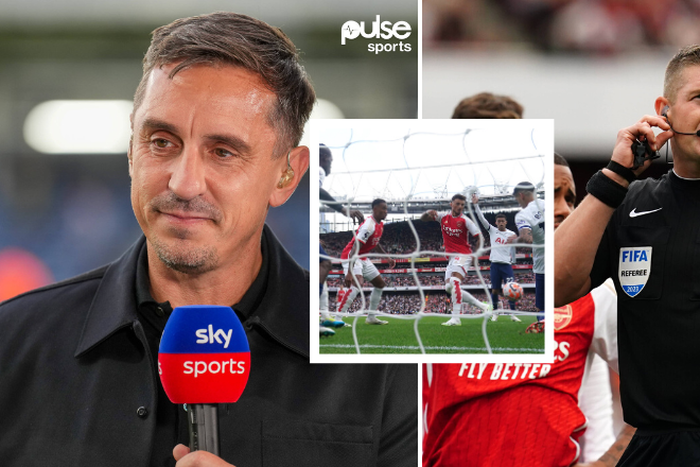 Manchester United legend Gary Neville has criticised the decision to give Arsenal a penalty for Christian Romero’s hand ball during the North London Derby, insisting that there was nothing the Argentine defender could have done to avoid the situation.