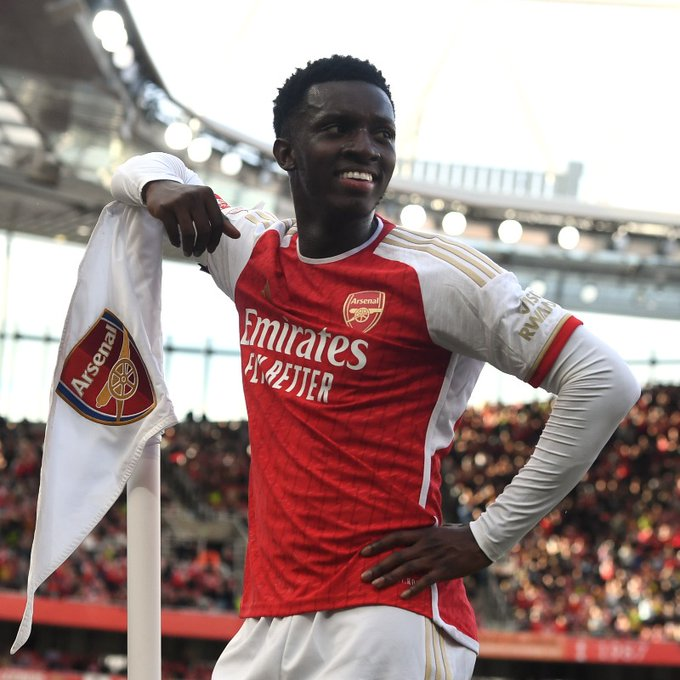 Eddie Nketiah celebrates a goal for Arsenal. (Photo Credit: Arsenal/Twitter)