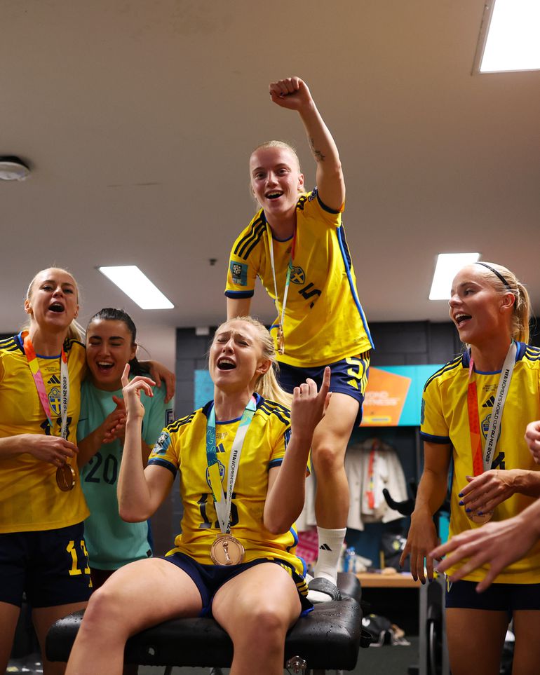 Sweden celebrate a fourth bronze medal win. (Photo Credit: FIFAWWC/X)