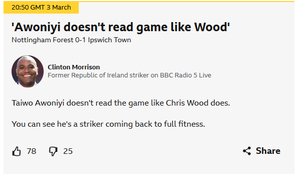 Clinton Morrison, while covering Nottingham Forest’s FA Cup game against Ipswich Town, stated that Taiwo Awoniyi does not read the game like Chris Wood.
