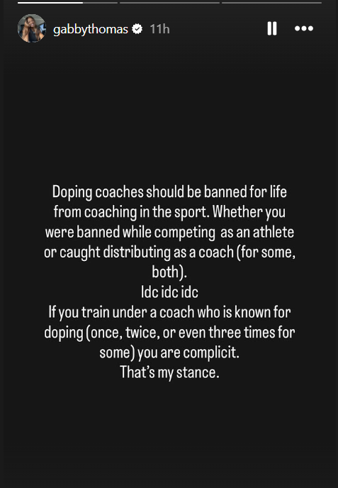 “Doping coaches should be banned for life from coaching in the sport. Whether you were banned while competing as an athlete or caught distributing as a coach (for some, both),” the American posted on her Instagram stories.