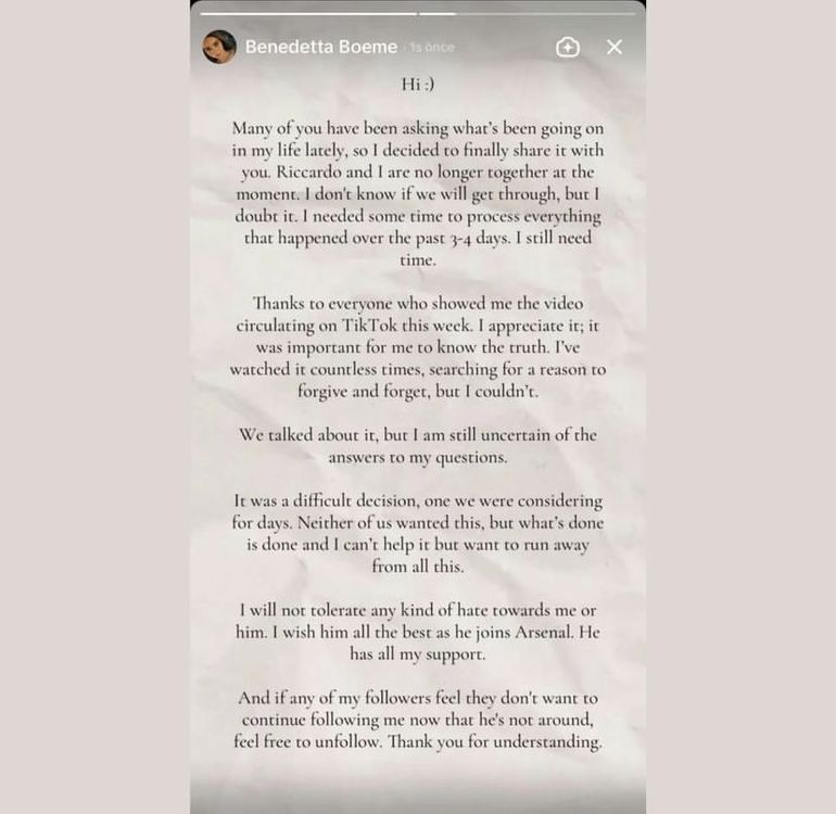 After Bendetta Boeme and Riccardo Calafiori unfollowed each other on social media, a statement on TikTok allegedly written by Bendetta went viral.