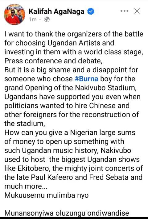 "It is a big shame and disappointment for someone who chose Burna Boy for the grand opening of Nakivubo Stadium," he said on his Facebook handle.