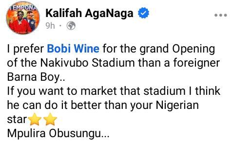 "I prefer Bobi Wine for the grand Opening of the Nakivubo Stadium than a foreigner, Barna Boy," he proposed.
