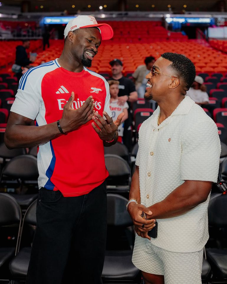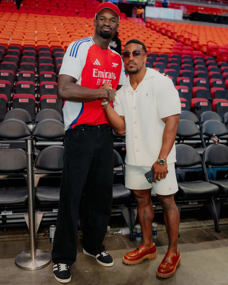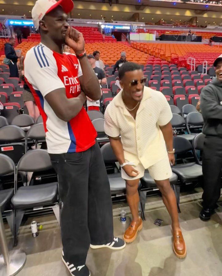 The images from the Sixers vs. Heat game show Bona, towering in his Arsenal jersey, standing alongside Hall, who sported a casual white button-up and shorts combo.