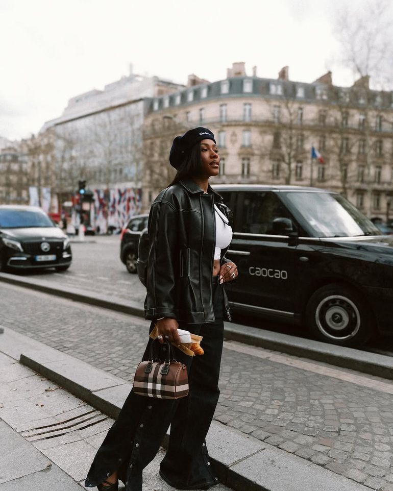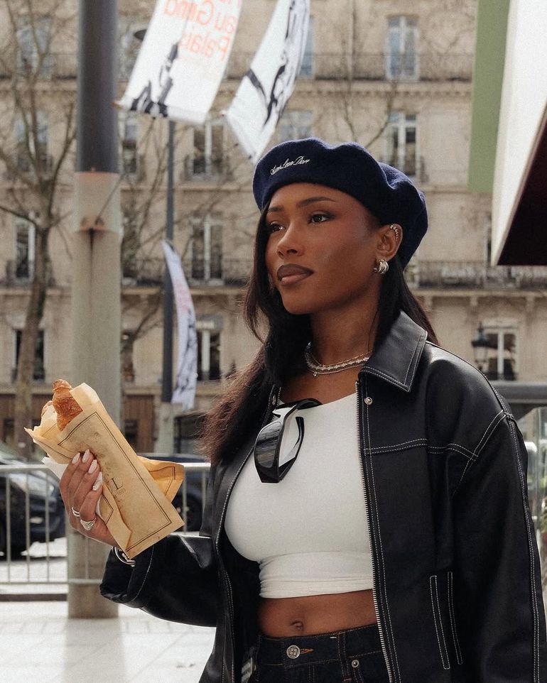 The 24-year-old media strategist and influencer showcased her impeccable fashion sense in a stylish denim and leather ensemble, completed with a chic wool beret, as she posed in front of the Brioche Dorée Café.