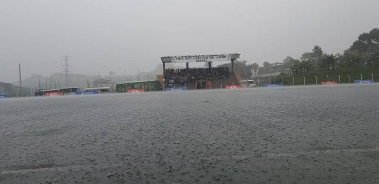 Referee George Olemu delayed the second half's restart for an hour because of heavy rainfall in Njeru, with the surface unplayable.