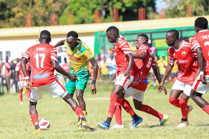 Jerome Kirya (GREEN SHORTS) against five Arua Hill players|JALE MORGAN IMAGE