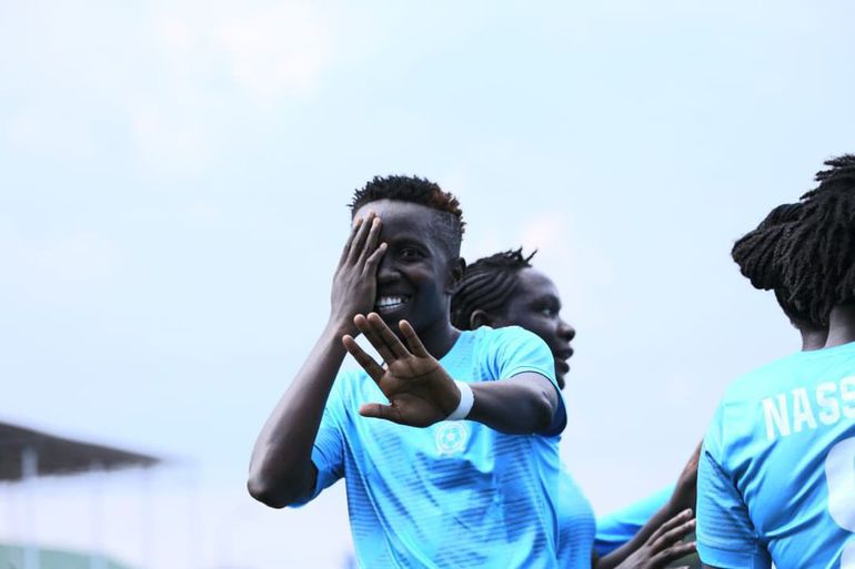 Kampala Queens forward Fazila Ikwaput celebrates a goal in the CAF Women's Champions league qualifier | CECAFA.