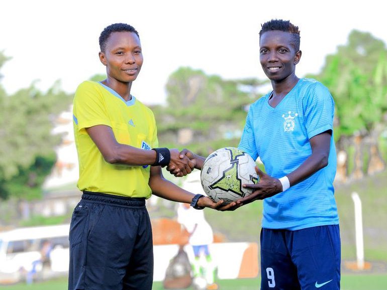 Tanzanian centre referee Tatu Nuru Malogo hands over the match day ball to Kampala Queens' striker Fazila Ikwaput after scoring five against FAD Djibouti in the CAF WCL | CECAFA
