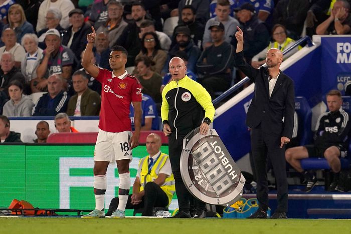 Manchester United manager Erik ten Hag brings on Casemiro during the Premier League match at the King Power Stadium on September 1, 2022.