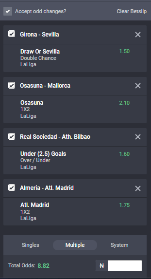 Cash out on Bet9ja with 8 odds accumulator for LaLiga games