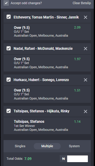 We have made available an accumulator of 7-odds from the Australian Open ATP and hope for a green week.