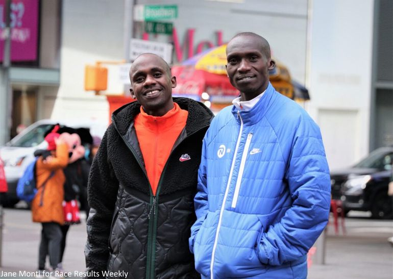 Jacob Kiplimo (left) and Joshua Cheptegei in Times Square three days before the 2023 United Airlines NYC Half / Photo by Jane Monti for Race Results Weekly