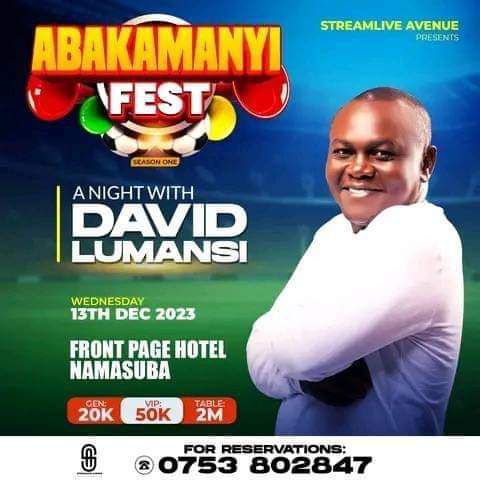 On Wednesday next week, all this and much more will form part of a whole night of David Lumansi and his fans at Front Page Hotel, Namasuba.