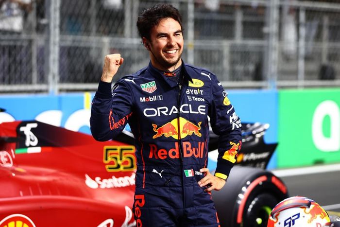 Sergio Pérez (Red Bull) celebrates his pole position at the Saudi Arabia GP / Image credit: Getty Images