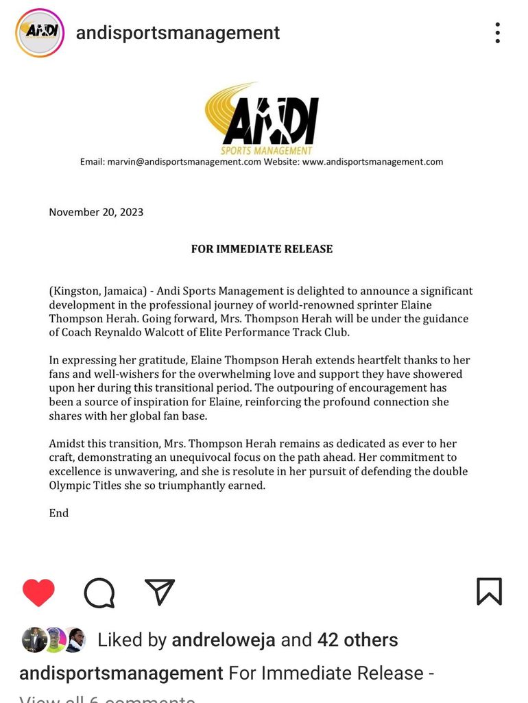 "Andi Sports Management is delighted to announce a significant development in the professional journey of world-renowned sprinter Elaine Thompson-Herah. Going forward, Mrs Thompson-Herah will be under the guidance of Coach Reynaldo Walcott at Elite Performance Track Club.
