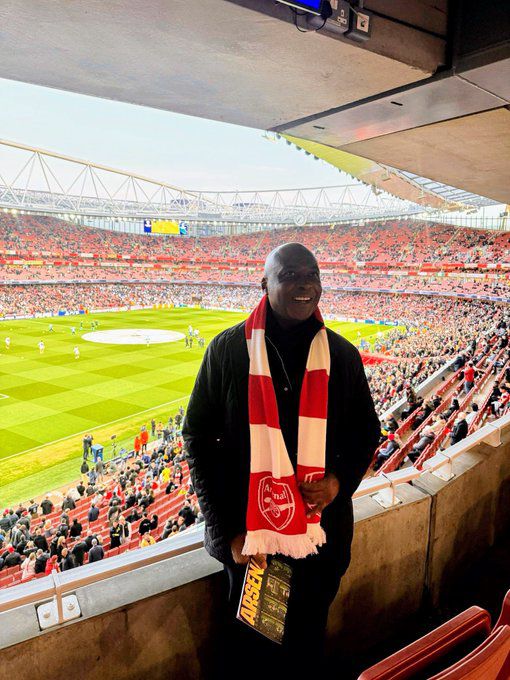 The former senate president posted on his X account, “Thrilled to be here at the Emirates Stadium tonight for the Champions League quarterfinal, Arsenal vs Real Madrid! Let's go, Gunners! #COYG #ARSRMA #UCL.”