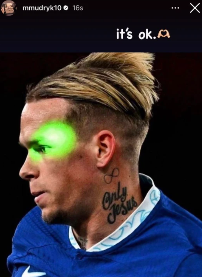 Mudryk has moved to play down the incident after Chelsea’s defeat as he posted an image of himself being targeted by the laser with the caption ‘it’s ok’ and an emoji of two hands making the shape of a heart.