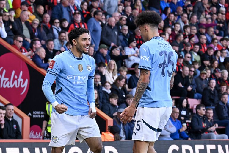 Omar Marmoush (left) celebrates a goal for Man City || Imago