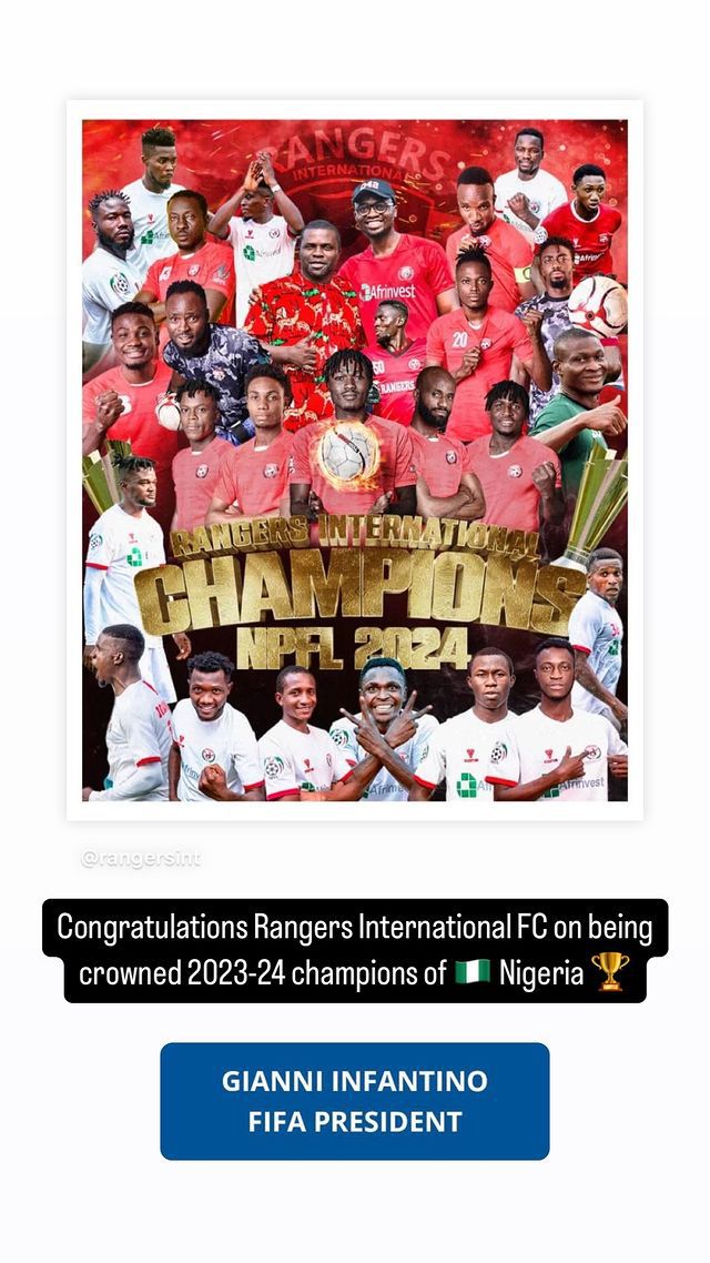 Infantino wrote on his Instagram story, “Congratulations Rangers International FC on being crowned 2023-24 champions of Nigeria.”