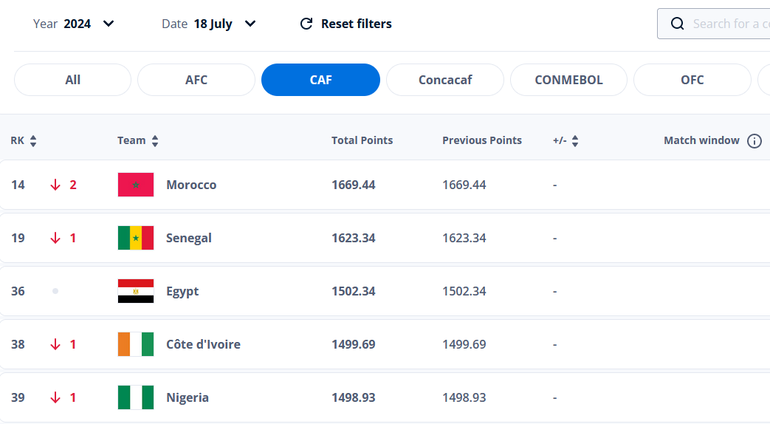 On the continent, Morocco, ranked 14th in the world, maintains its position as the number one ranked team in Africa after making history by reaching the semi-final of the 2022 FIFA World Cup in Qatar.
