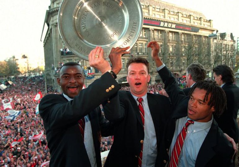 Finidi George celebrates winning the Eredivisie with Loius van Gaal and Edgar Davids | 90s Football onX