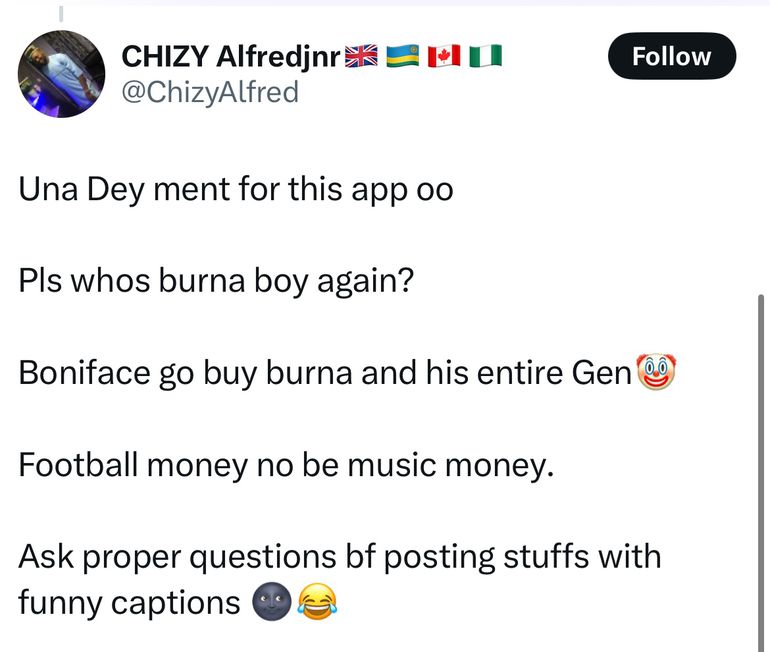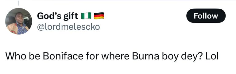 A user quipped: “Who be Boniface for where Burna Boy dey? Lol.”