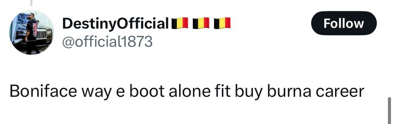 One user on X, formerly Twitter, wrote: “Burna no send Boniface,” implying the artist was unimpressed by the football star’s presence.
