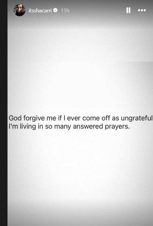 “God forgive me if I ever come off as ungrateful. I am living in so many answered prayers,” Richardson posted on her Instagram stories.